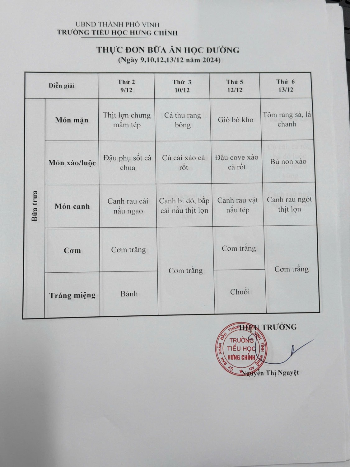 THỰC ĐƠN BỮA ĂN HỌC ĐƯỜNG
