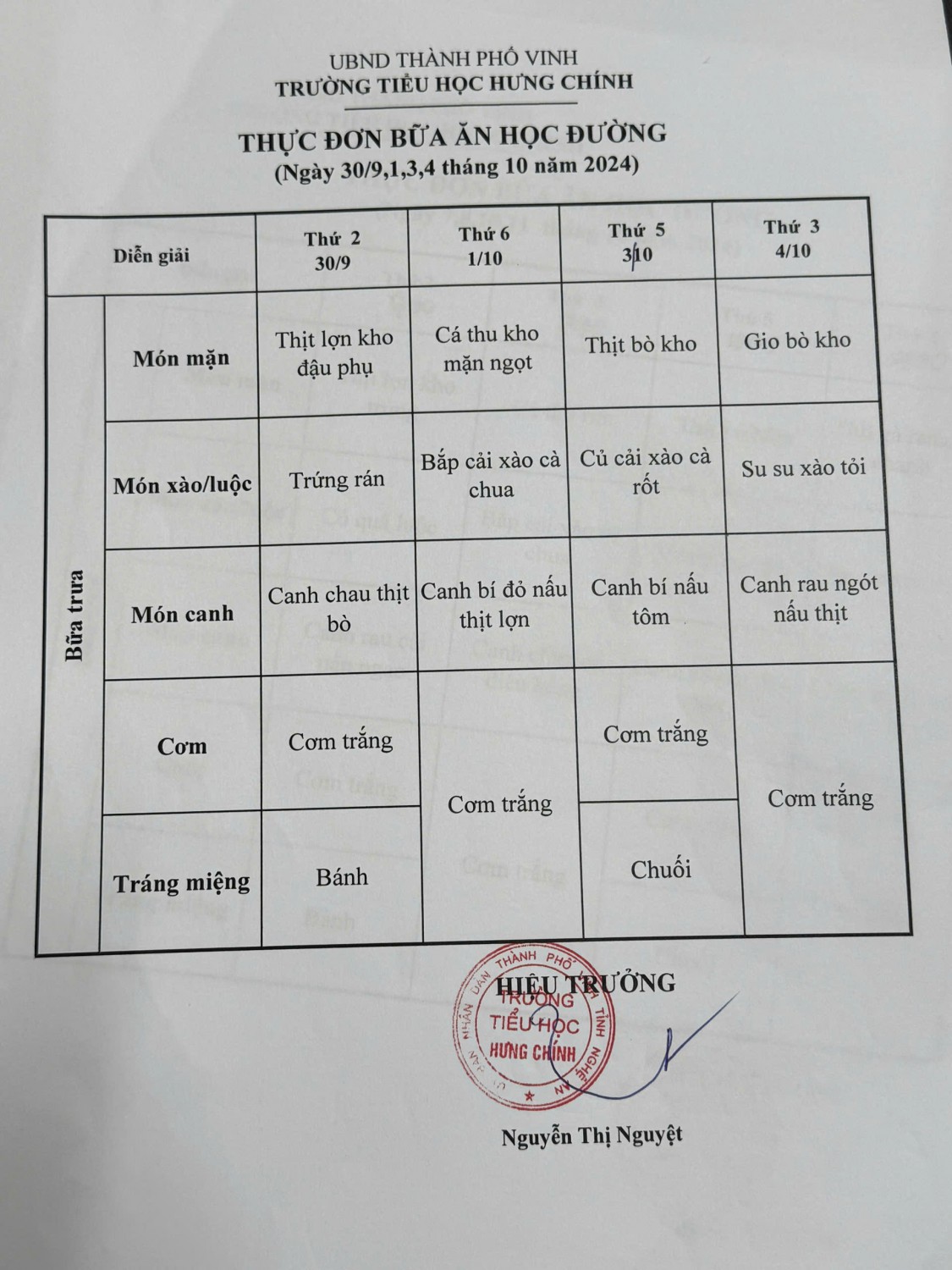 THỰC ĐƠN BỮA ĂN HỌC ĐƯỜNG
