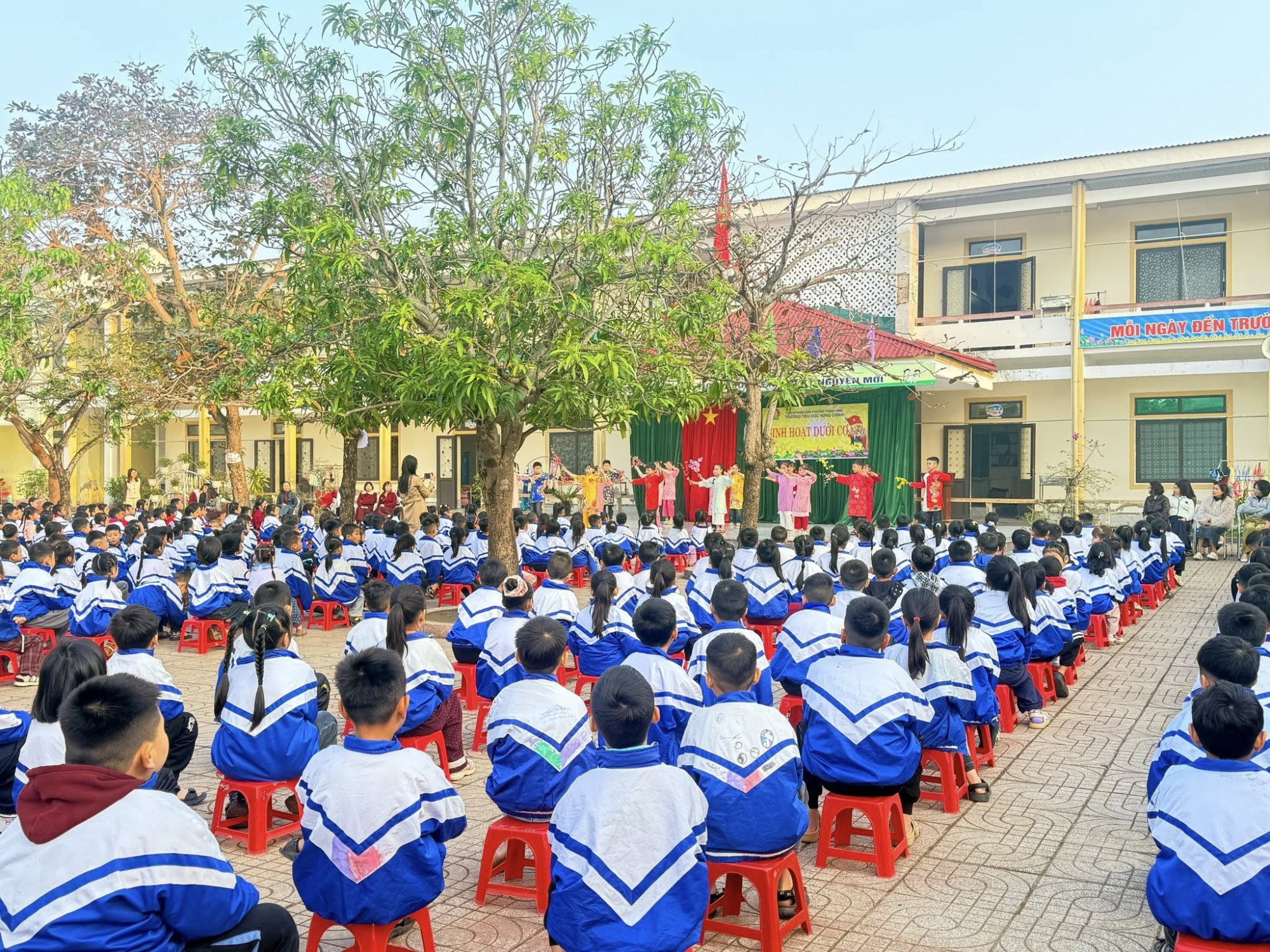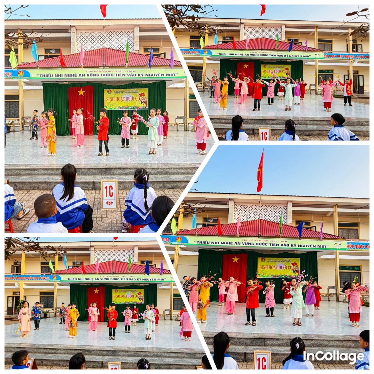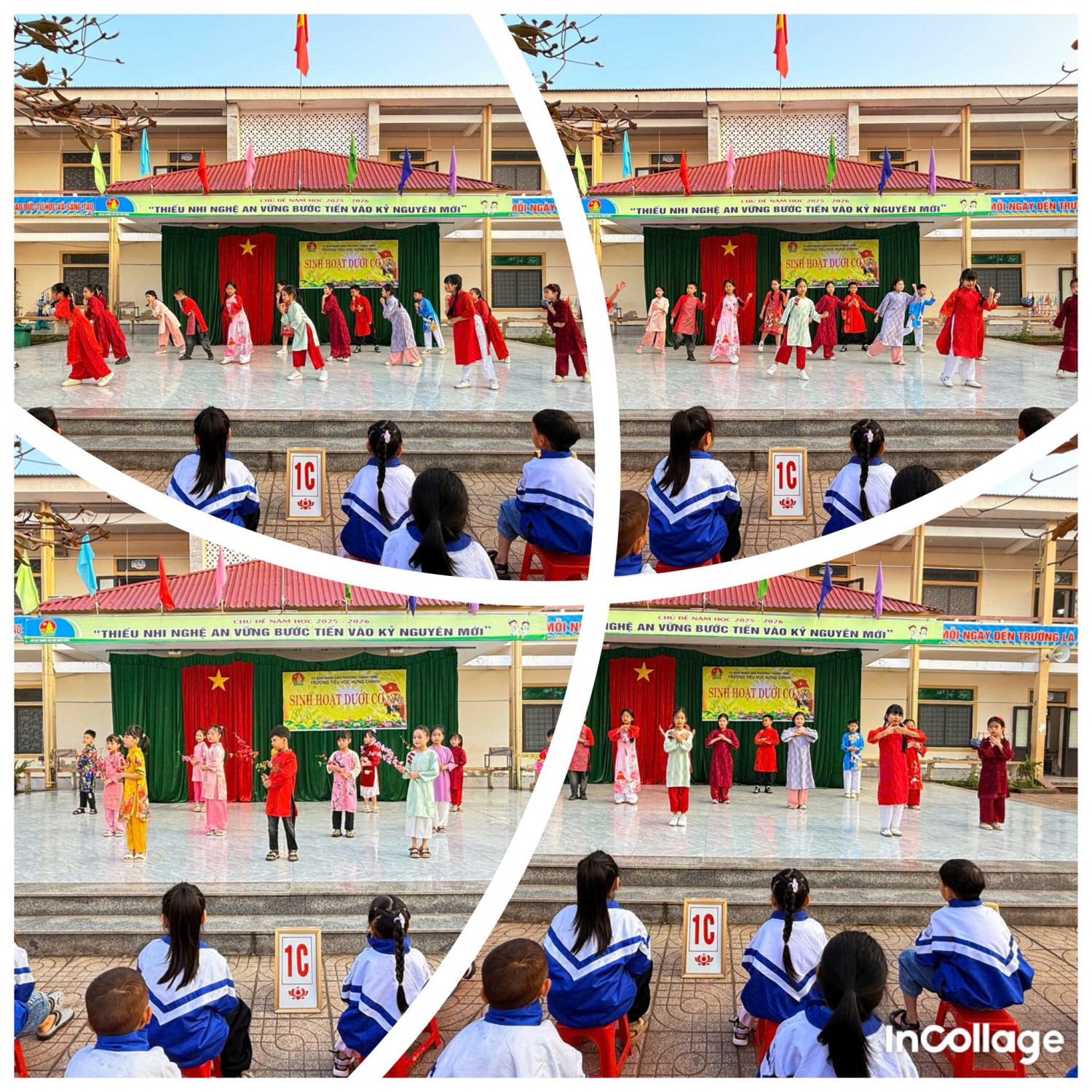 SINH HOẠT DƯỚI CỜ – RỘN RÀNG SẮC XUÂN Trong không khí tươi vui những ngày cuối năm, buổi sinh hoạt dưới cờ của thầy và trò Trường Tiểu học Hưng Chính trở nên rộn ràng hơn với những lời ca trong trẻo, những điệu múa uyển chuyển mừng xuân. Góp phần tạo nên không khí tươi vui của buổi sinh hoạt dưới cờ là các tiết mục văn nghệ mừng xuân do các em học sinh biểu diễn, bao gồm: “Tết ơi tết” - Do các bạn lớp 2C thể hiện “Một vòng Việt Nam” - Do bạn Anh Thư thể hiện “Tết đến thật rồi - Chuyện cũ mình bỏ qua” - Do các bạn lớp 4A trình bày “Tết đong đầy” - Do các bạn lớp 4D thể hiện Những giai điệu trong trẻo, những điệu múa uyển chuyển ấy đã mang mùa xuân đến thật gần với mái trường Tiểu học Hưng Chính.